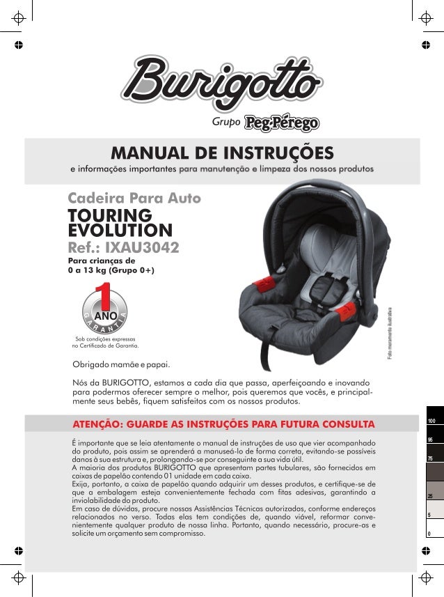 Cadeira Touring Evolution Manual Burigotto - O bebe conforto touring evolution se da burigotto e indicado para criancas de 0 a 13kg, tem capota removivel, pode permanecer com a capota quando no automovel.